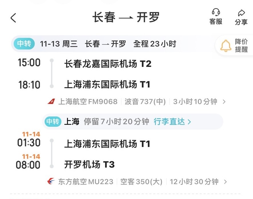 11.13 长春—开罗 学生补贴机票 可以出两个23kg行李额 价格便宜