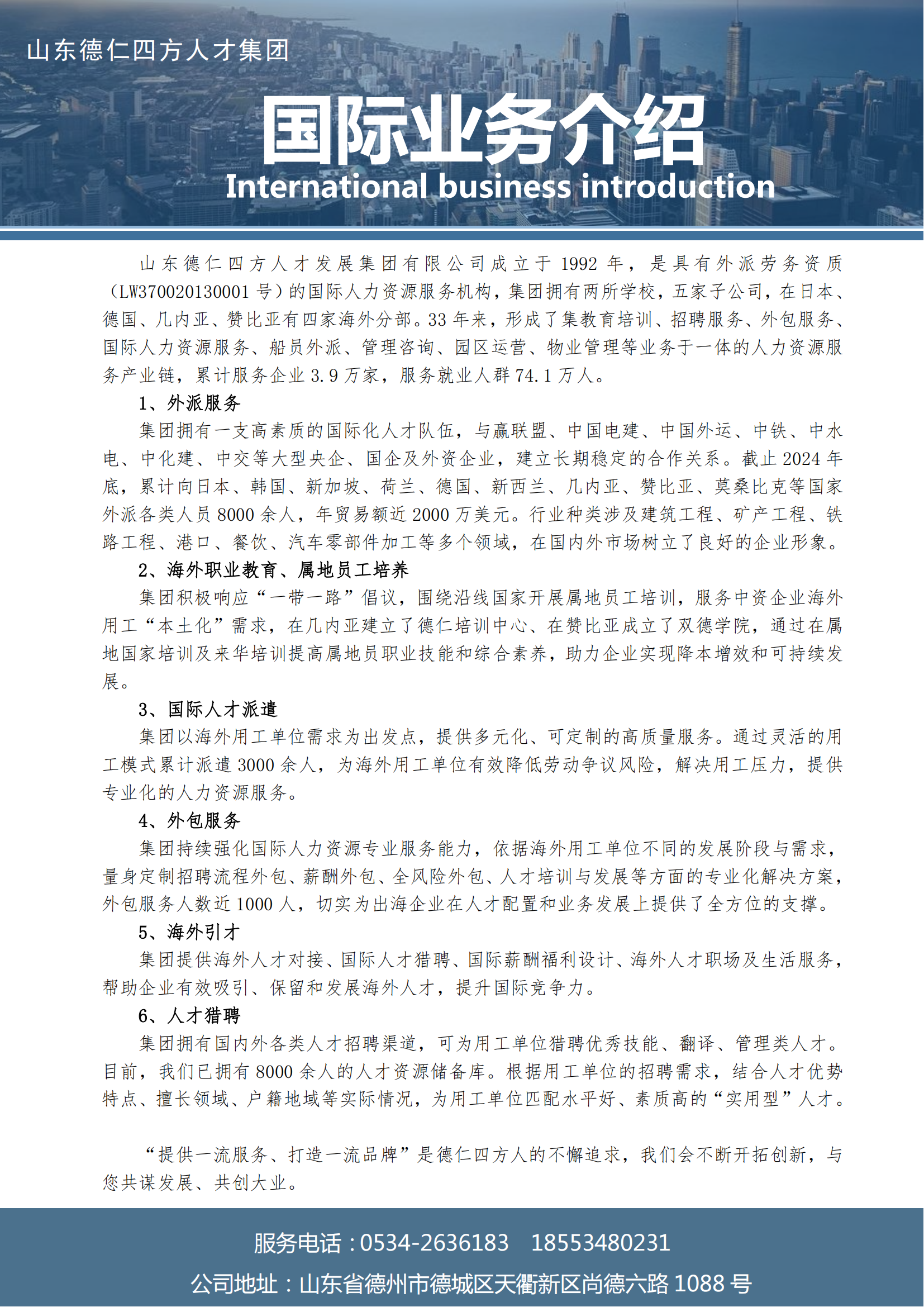 By oqwD05fFbRm8A-…, 4 August, 2025 Log in to post comments 山东德仁四方人才集团,成立于1992年,持有商务部《对外劳务经营资格证书》的专业人力资源服务机构,专注为出海中资企业量身打造全方位人力解决方案。 从精准高效的招聘派遣、灵活适配的外包服务,到覆盖中方员工与属地员工的定制化培训,我们全程护航企业海外发展。目前,我们已在几内亚、赞比亚设立直属海外分校,凭借本土化服务网络,能快速响应企业在跨文化管理、人力储备等方面的需求,让您的海外团队建设更省心、更高效。 信息类别 商业广告 comments images location 中国.德州