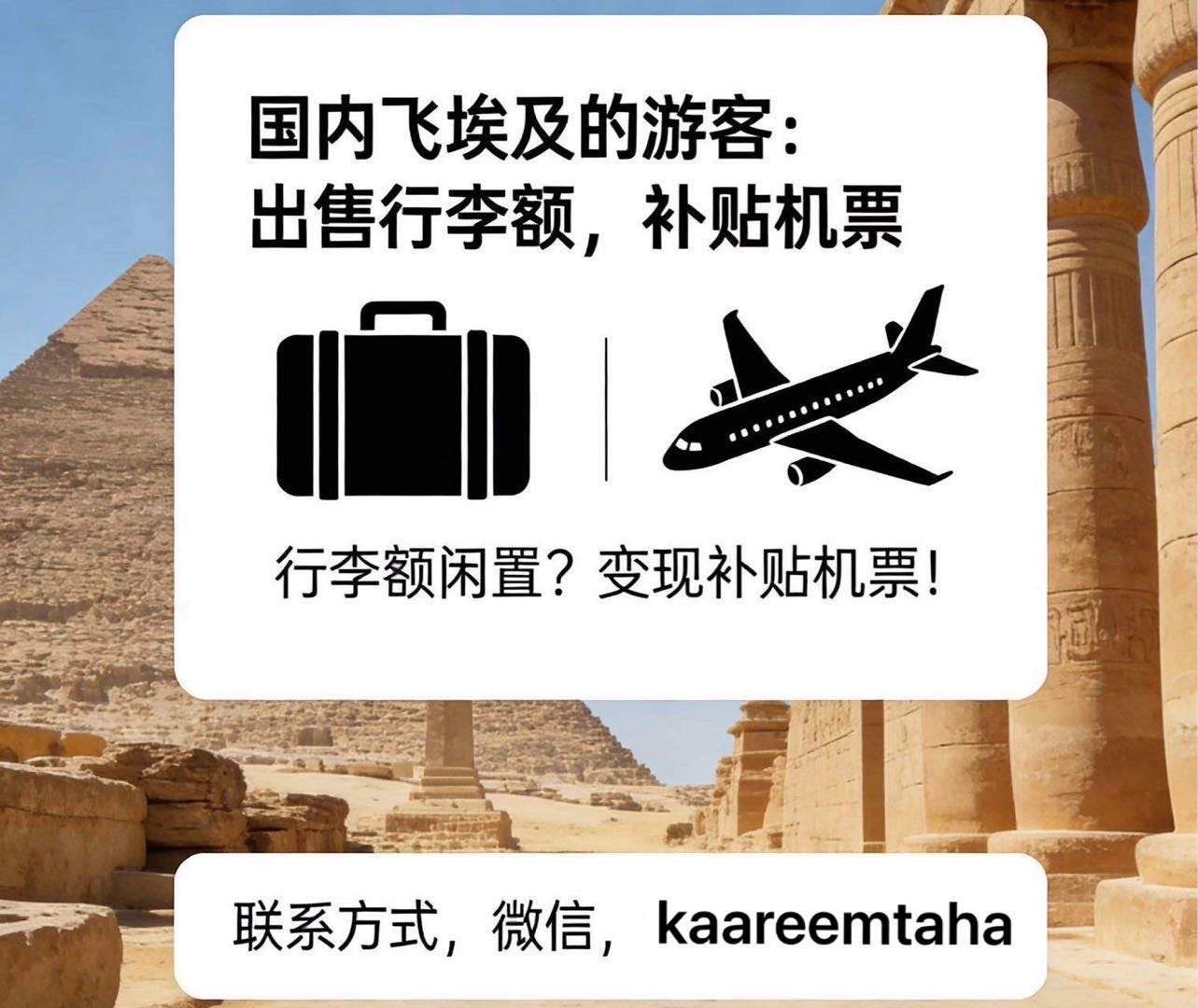 By oqwD05cdgtWdn2…, 4 March, 2026 Log in to post comments 你好,我是埃及人。我需要与经常往返埃及的人建立长期合作关系,用来运送货物(服装和鞋子)。我可以提供机票补贴。我需要按行李箱计算价格,而不是按公斤计算。 微信:kaareemtaha 信息类别 旅游&搭子 comments images